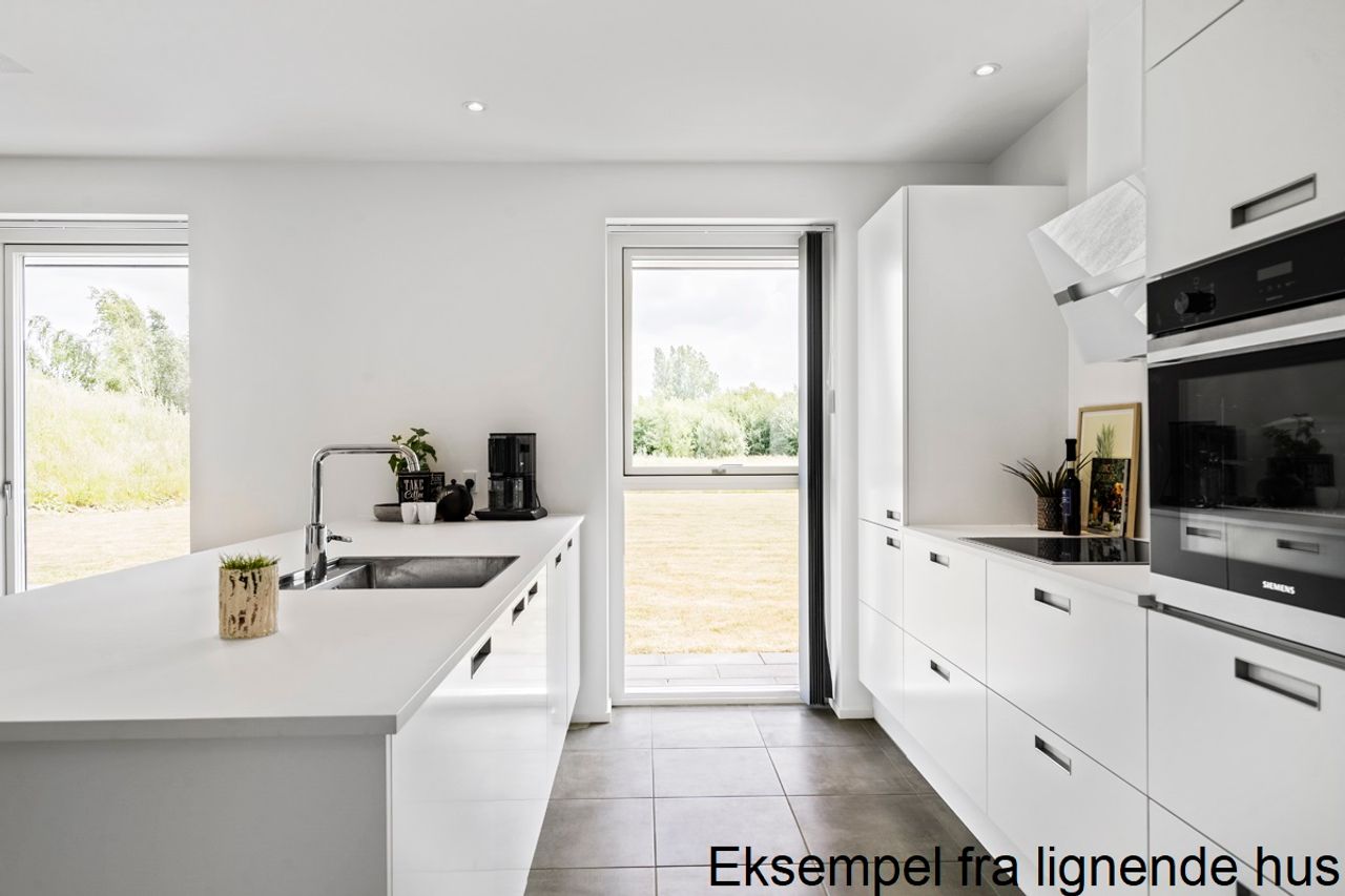 Facaderne udføres i blødstrøgne sten, tagene i sorte betontagsten og vinduerne som 3-lags træ/alu fra Velfac. Indvendigt mødes man af lyse trægulve, gipslofter og en gennemgående modernitet, som skaber et harmonisk og tidløst udtryk. Planløsningen er stort set identisk i de to huse: et stort og åbent køkken/alrum med ovenlys og direkte udgang til terrasse, en sammenhængende opholdsstue med store vinduespartier, fire gode værelser, hvoraf forældreafdelingen har walk-in og eget badeværelse, samt endnu et badeværelse, et rummeligt bryggers og et separat depotrum. Alt er disponeret med fokus på funktionelt flow, gode opbevaringsmuligheder og et naturligt lysindfald.